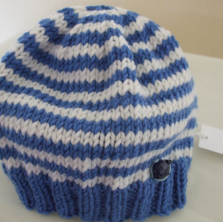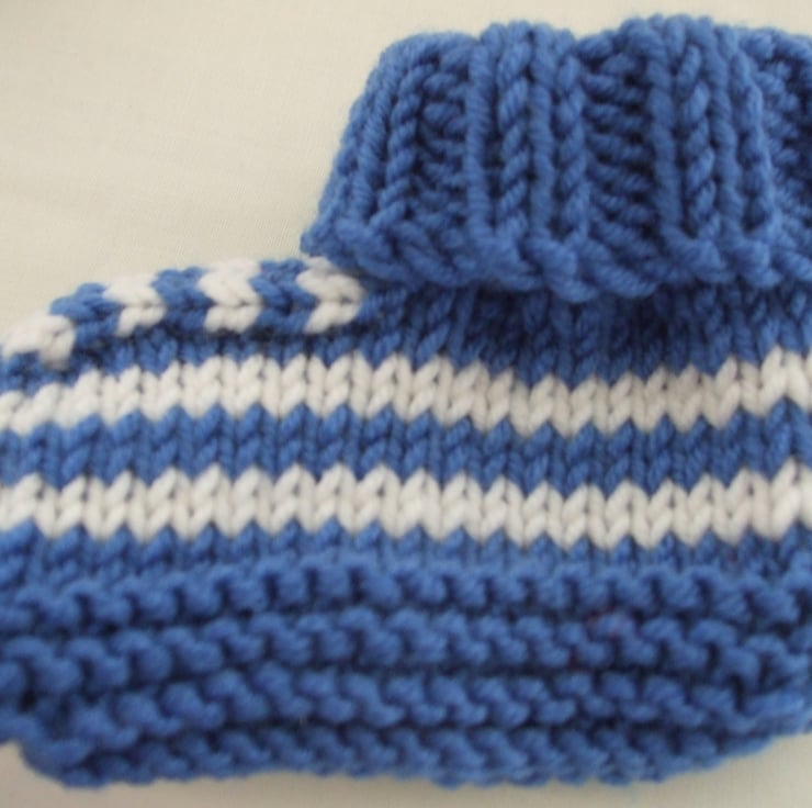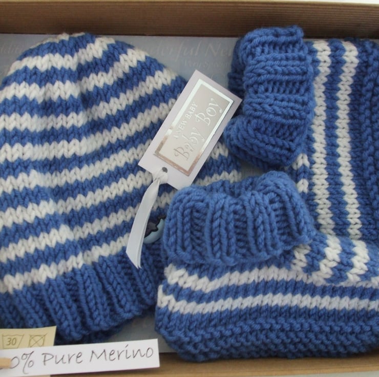 Hand knitted blue and white striped baby hat and booties set in a soft 100% merino wool