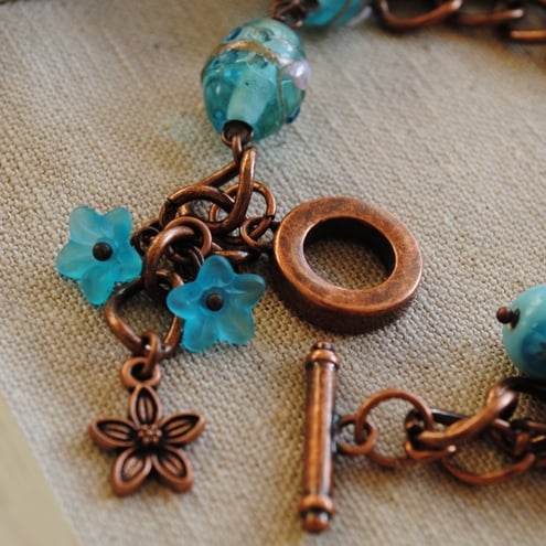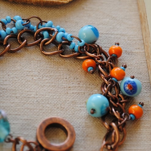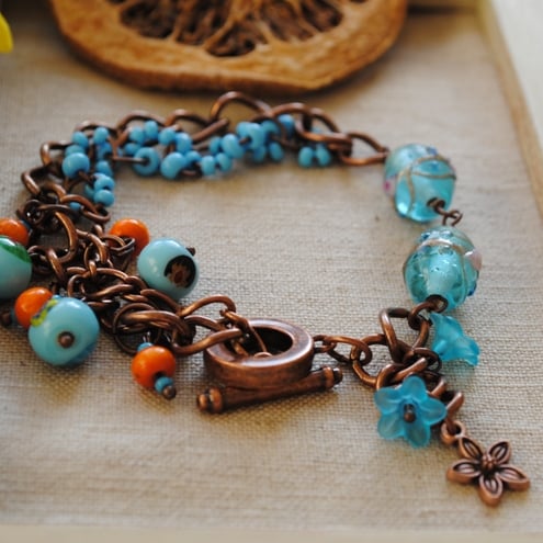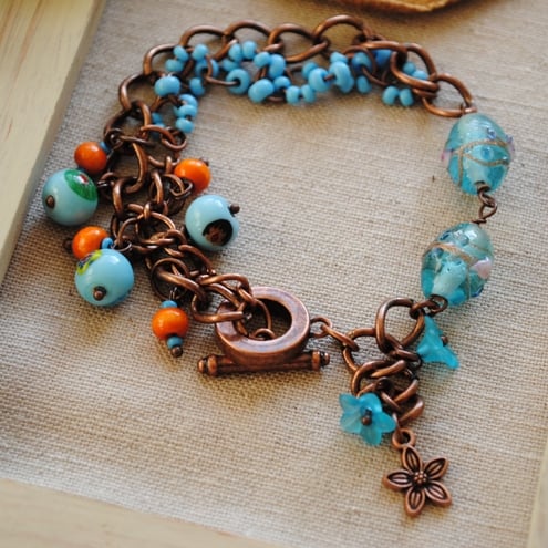 Copper charm bracelet in shades of turquoise with a splash of orange. The bracelet features a dangle charm chain featuring lucite flowers finished with a copper flower. The bracelet is made using a mix of styles with one third made from linked lampwork beads, another third made from a chain of rings with turquoise seed beads and the final third a more traditional charm bracelet with beads in turquoise and orange.