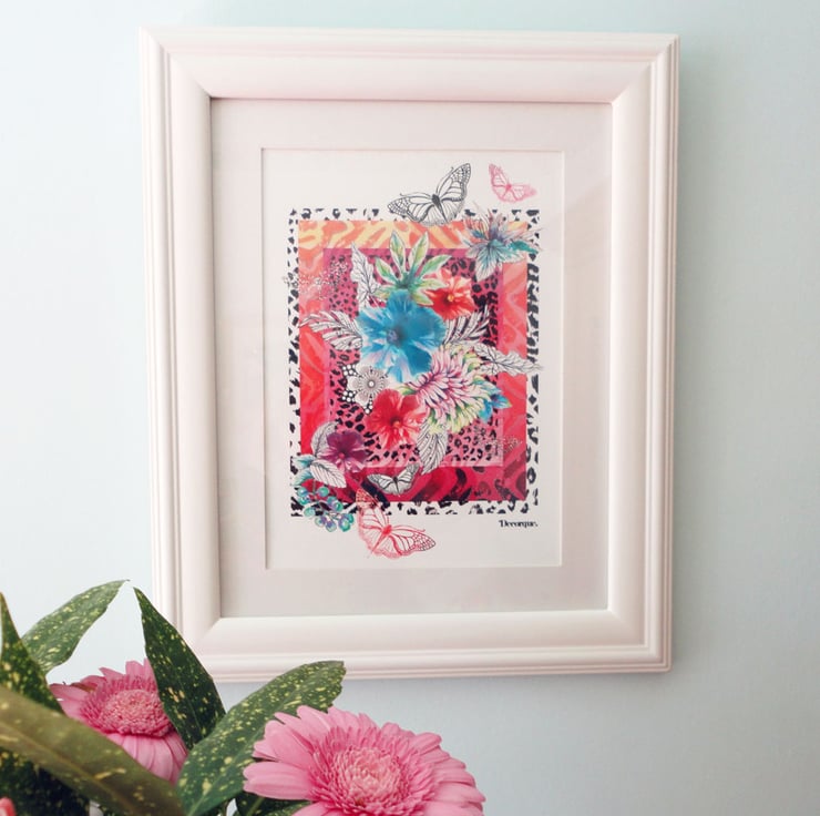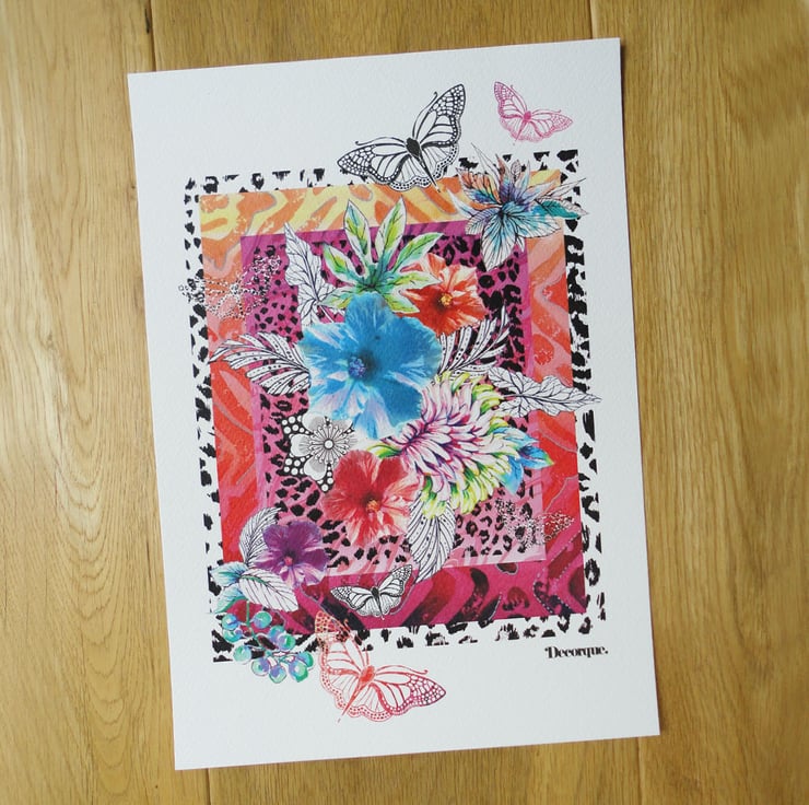 Frames inside frames of skin-print, black and white changes to hot bright skins, which surround the exotic flowers and leaves. Butterflies flutter in and out of the frames passing the tropical foliage.