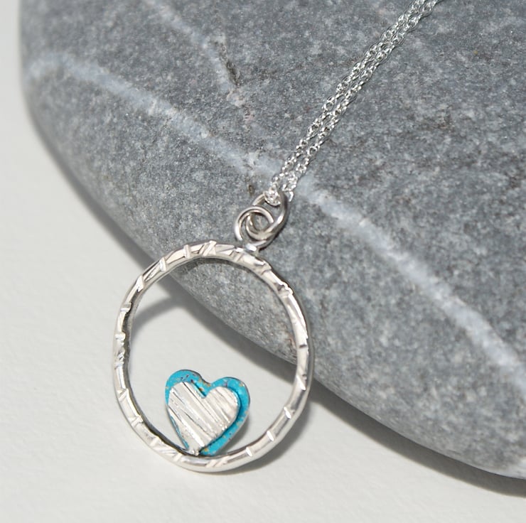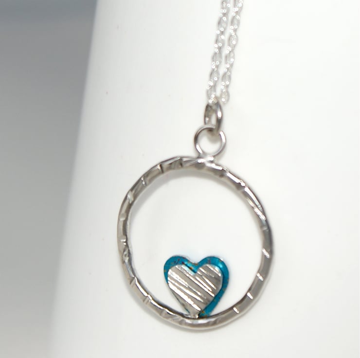 Gorgeous pendant featuring a tiny textured silver heart set against a hand painted turquoise aluminium heart. These are set in a textured silver circle and hung from a sterling silver chain (please let me know if you would like a 16 or 18 inch chain when you order).