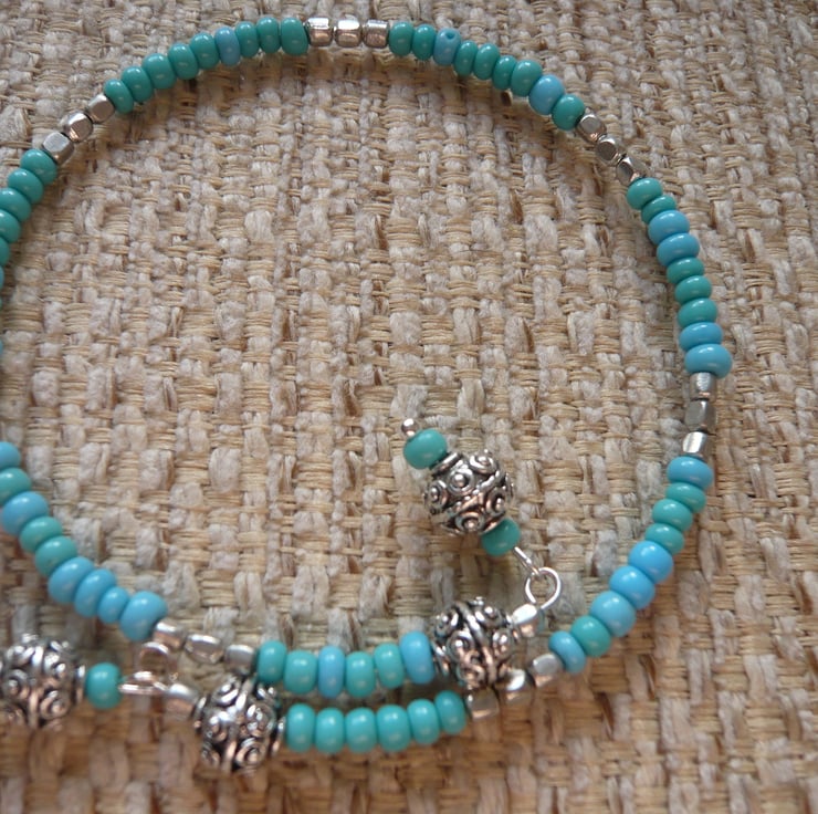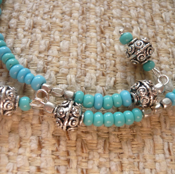 Hi, This bracelet/bangle is made from a single coil of memory wire. I have added tibetan style spacer beads to the ends and hanging from each end of the coil for a beautiful effect.