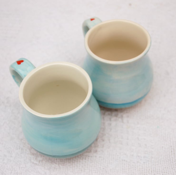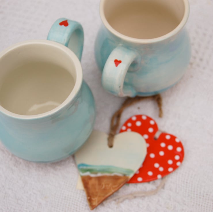 This listing is for two mugs and a free handmade ceramic gift tag...please choose between a matching beach or a red and white spotty one!
