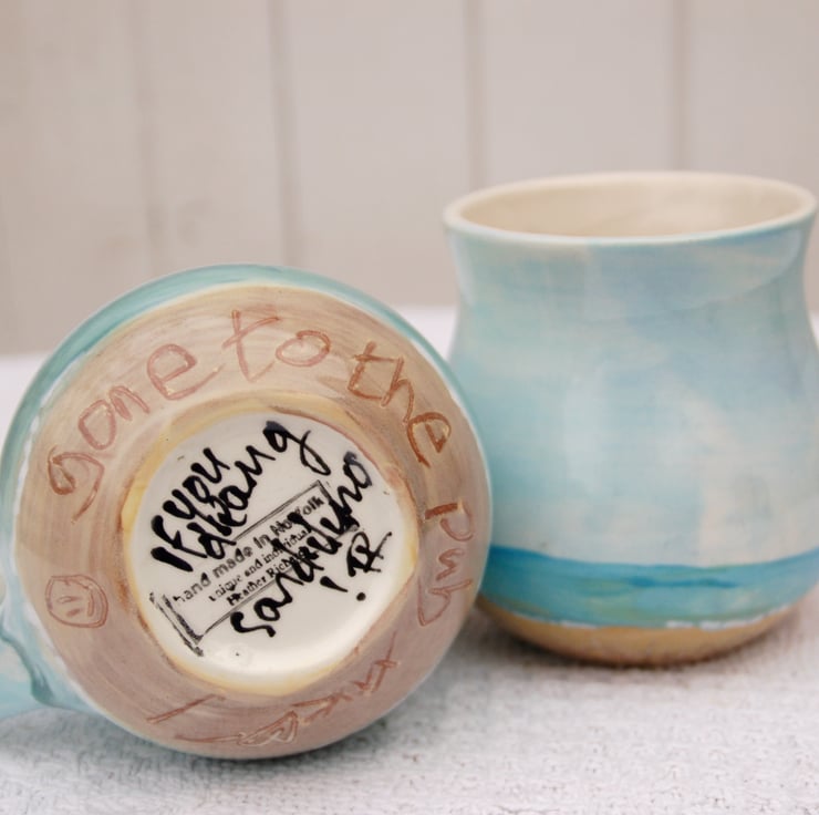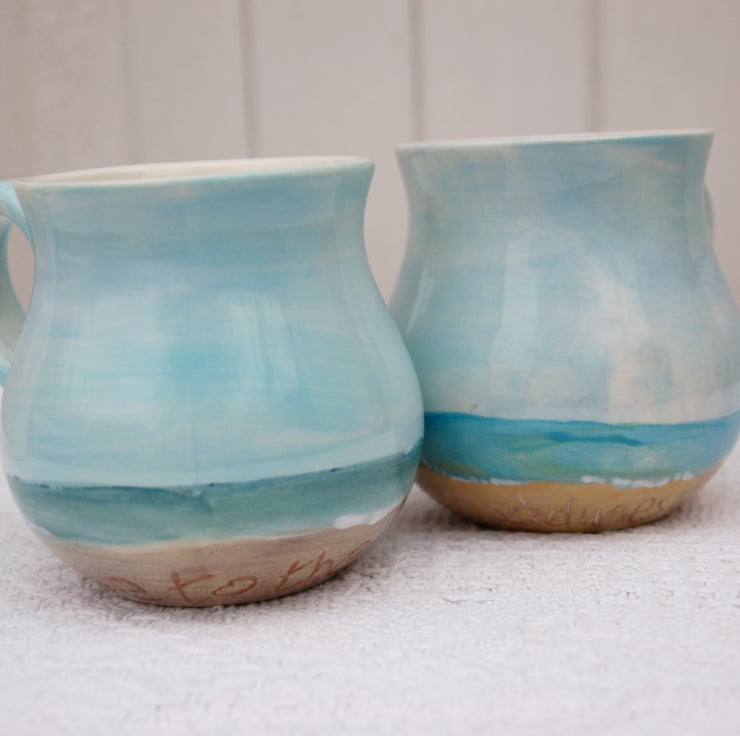 Two lovely holdable mugs with my 'if you dream of sand dunes' design individually painted round the mug. The message in the sand is scratched into the thick paint, it looks like a message that you would have written for your valentine on a long beach walk in North Norfolk.