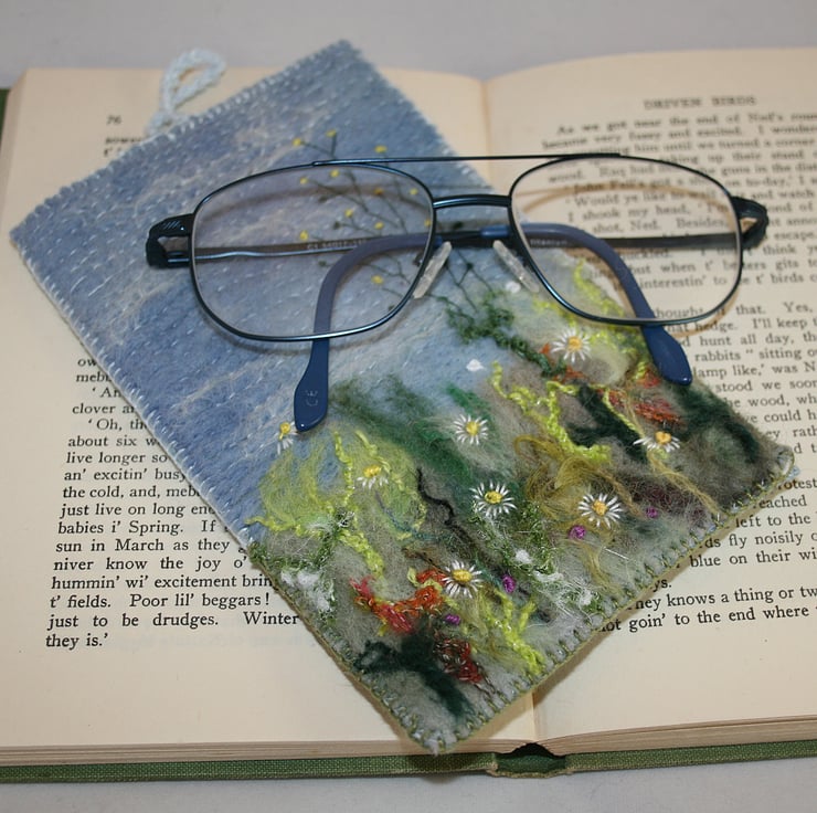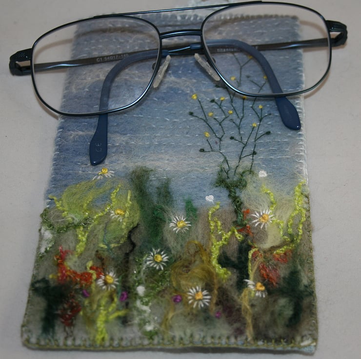 This glasses case has been entirely hand-stitched from a lovely piece of 'meadow' felt, created from a variety of hand-dyed fibers, and hand-embroidered with a lovely sprinkling of meadow flowers.