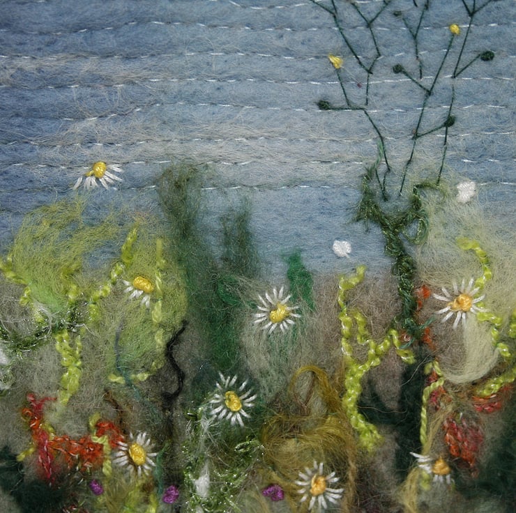 Sky blue wool fibers have been felted to a background of kunin felt (produced from recycled plastic bottles. A wide variety of yarn snippets, carefully collected from other yarn projects, have been added to represent the meadow. Stitching in fine cotton has been added to the sky to 'stabilise' the felting. The case is edged in blanket stitch using threads to match the areas of the design. Simple embroidery stitches have been used to add distant daisies and buttercups. The daisies and clover in the foreground are stitched in more detail using more strands of embroidery thread to add perspective.