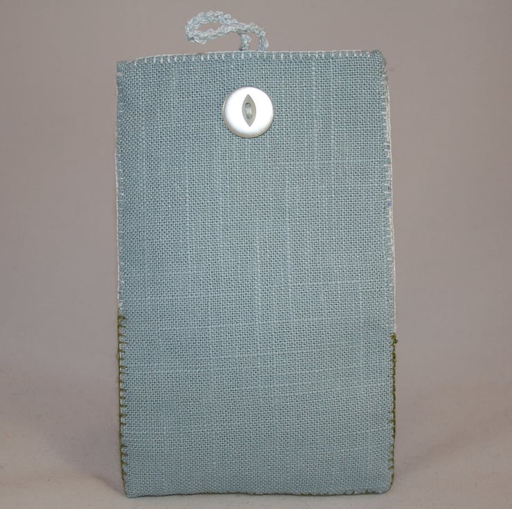 The case is lined in a printed cotton fabric - blue harebells on a white background, backed with iron-on interfacing. The reverse of the cover is a pale blue linen fabric. The case is seemed with blanket stitch in a pale blue crochet cotton for durability. The case closes with a crocheted loop - using the same blue cotton thread, over a white button.