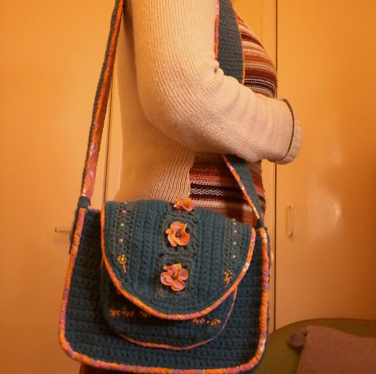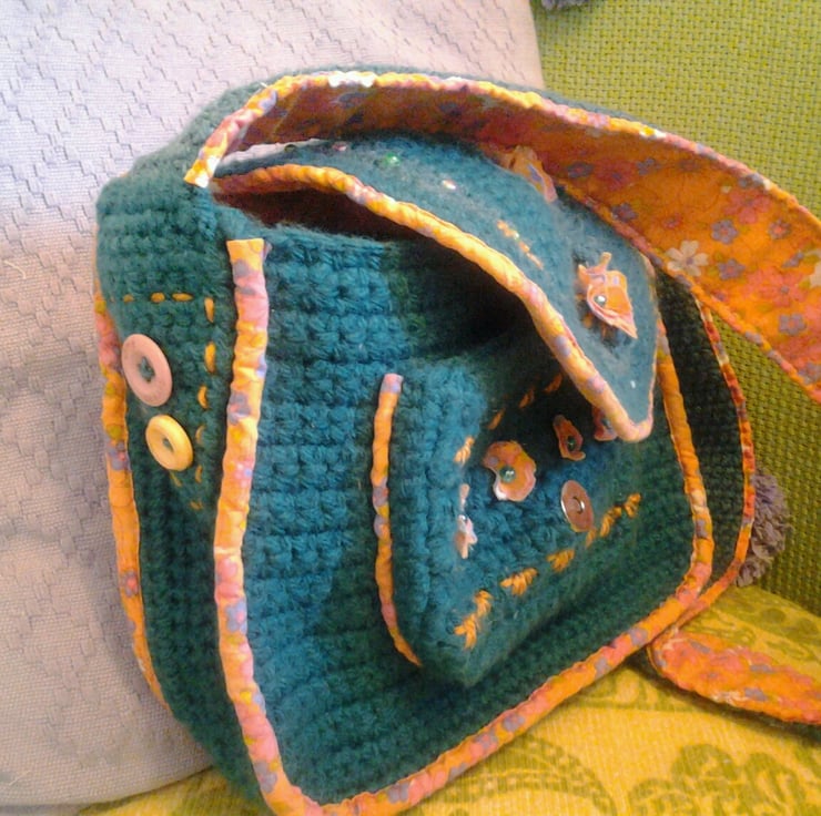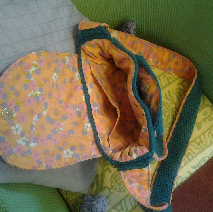 I have crocheted this bag using 100% Acrylic wool. It has been fully lined and decorated with pretty orange flower print fabric. It has a lined pocket at the front and over flap both with similar pretty flower and stitch design.