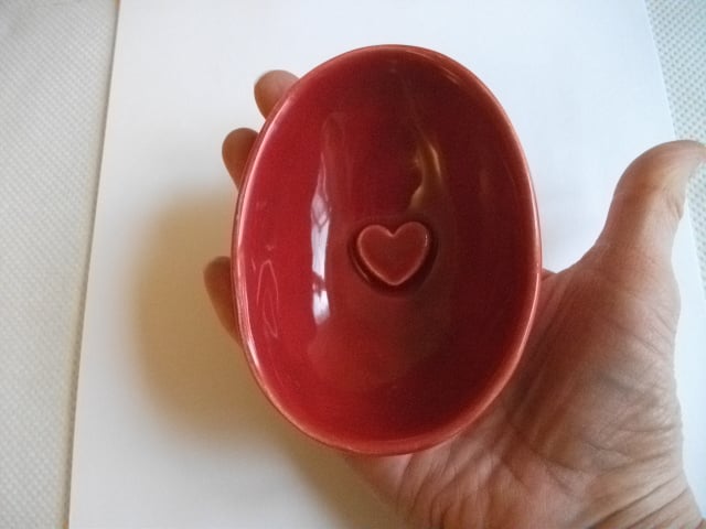 This half a red egg is hand formed and is glazed in a rich ruby red and has a little heart in the centre. Glazed three times and fired twice..
