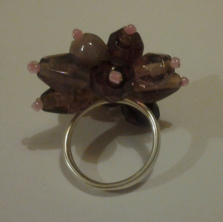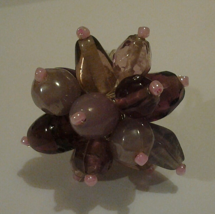 I have made this sweet little bead cluster ring using a selection of pretty purple glass beads all wired together to create an attractive design. The beads are wired directly onto a silver plated wire ring, making it very strong and secure.