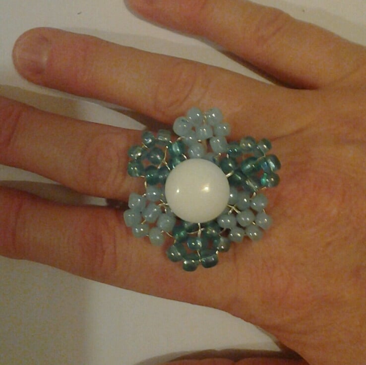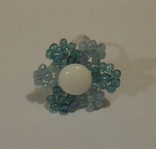 I have made this sweet little dress ring using small blue glass beads all wired together to create an attractive flower design with a white glass pearl centre and mounted onto a silver plated wire ring.