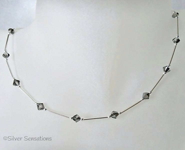 Silvery Grey Black Swarovski Crystals & Sterling Silver Tubes Designer Necklace
