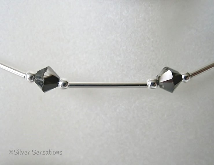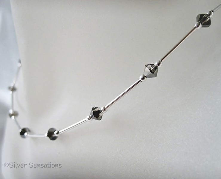 A beautiful, designer necklace which has been hand crafted using Sterling Silver straight tubes with stations of silvery grey black Swarovski Crystals.