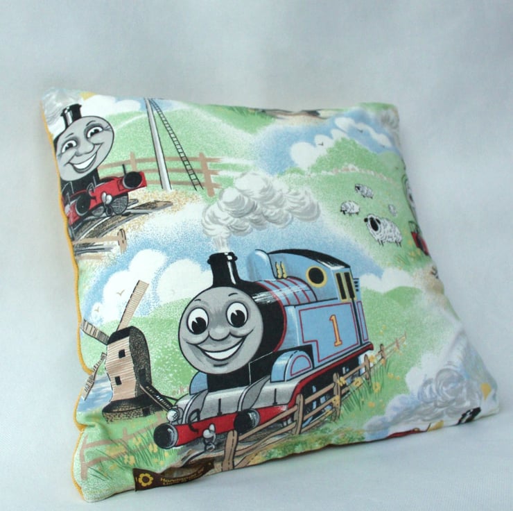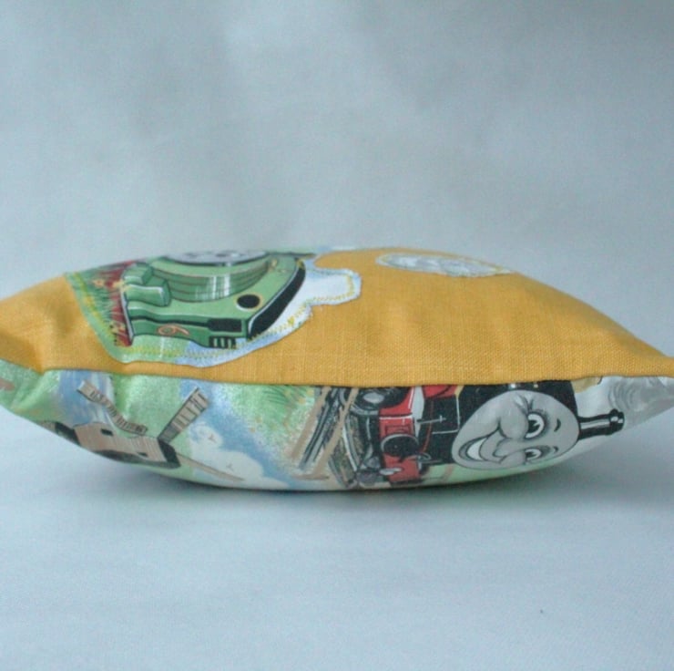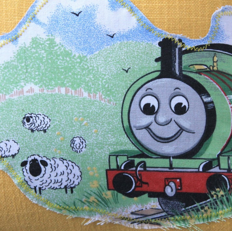 This is a sweet kid's cushion for those boys (or girls) that love the Thomas the Tank Engine stories. The front consists of a yellow tweedy material with an applique motif of Percy, the green engine no. 6. The back of the cushion is made from the same material and it shows Thomas and other of his engine friends. The Thomas fabric is a genuine vintage medium weight cotton. The yellow fabric is a contemporary material consisting of a synthetic and cotton mix.