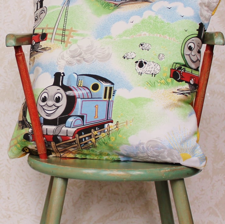 We love colours and vintage materials, so we try to incorporate them as much as we can in our creations. We like to look through markets and auctions for little gems of the past, in this way also re-using and recycling materials. This cushion is made using a vintage Thomas the Tank Engine fabric and will be loved by those little ones who enjoy his stories.