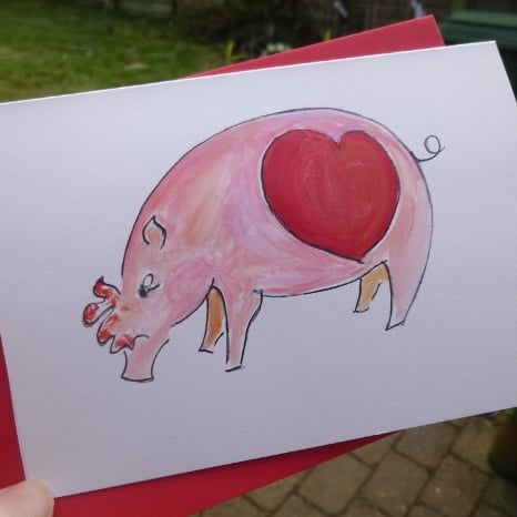 My new design "Hog Happy!" is an original, hand painted illustration created with love and humour for that special someone. My cards are all handmade using recycled card and envelopes. Each one is A6 presented with a red envelope in biodegradable clear sleeve.