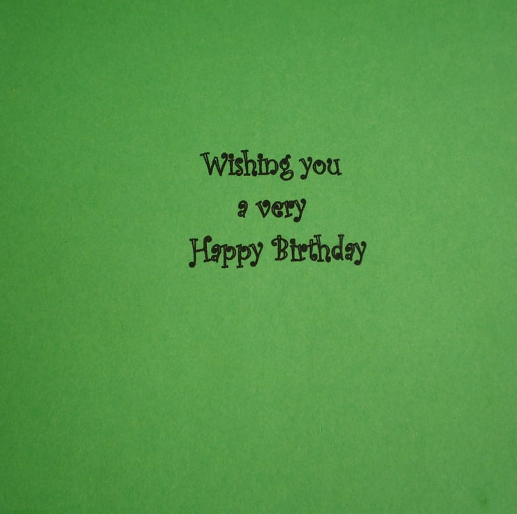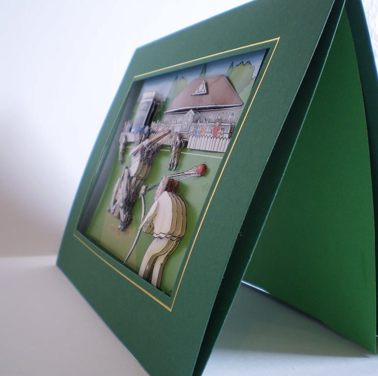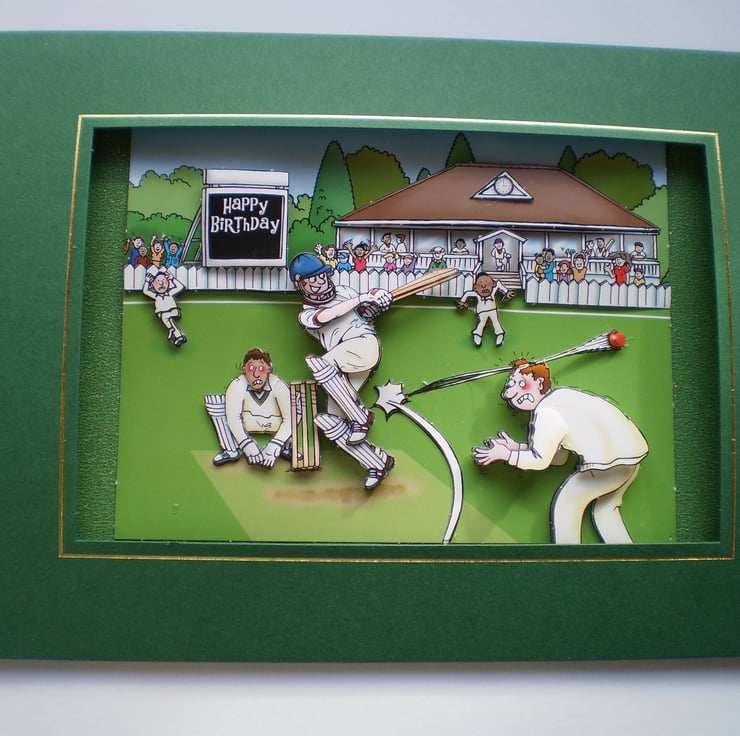 A dark green card measuring 150x203mm (6x8in), with an oblong aperture which borders the decoupage 3Deffect cricket team . The Happy Birthday score board can be adapted with an age if you would prefer. Insert is green with a birthday greeting