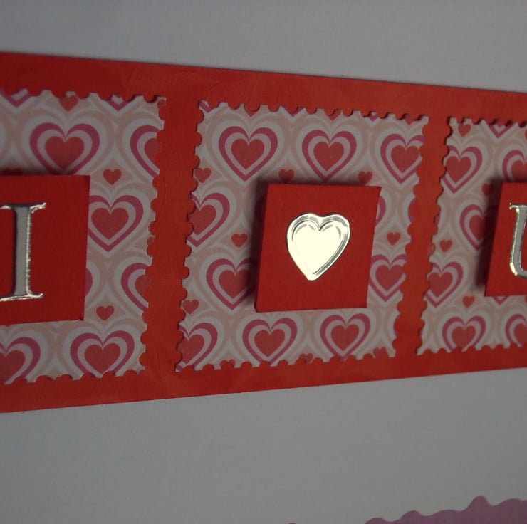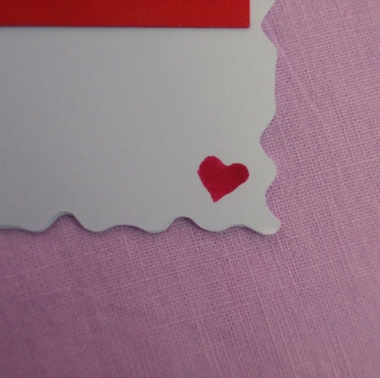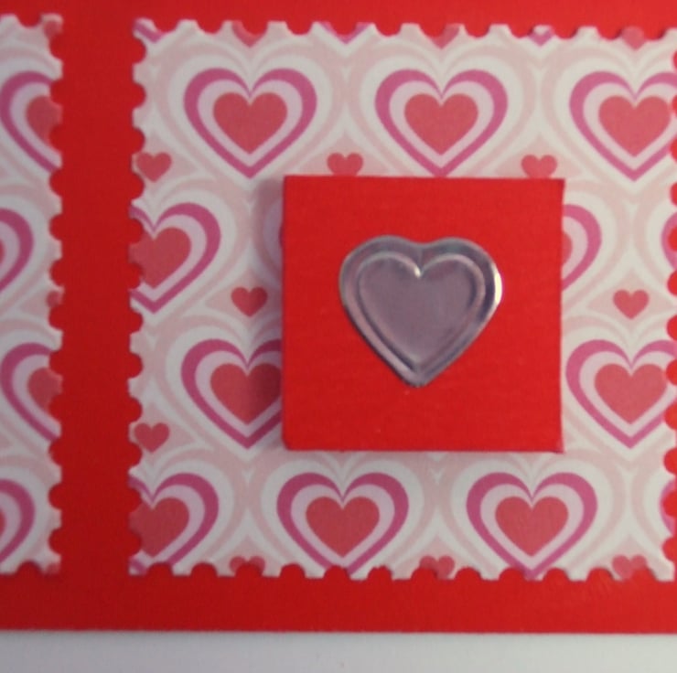 The base card is a bright white & has a decorative edge, I've stamped 2 small hearts onto the bottom corners. I've made the topper from a base layer of red card, the postage stamp shaped layers have been cut from patterned paper then small red card squares placed on top with 3D sticky pads, the letters & heart are silver peel-offs.