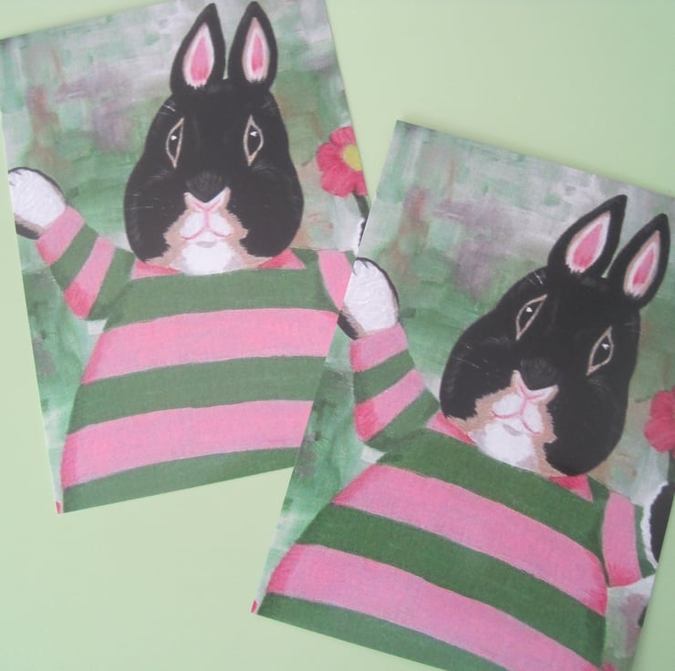 This listing is for two (2) bunny postcards, featuring my portrait of Blackberry Bunny, who is the 'face' of Dandelion's Gallery (Dandelion didn't want to wear pink for a picture, he likes yellow better...)