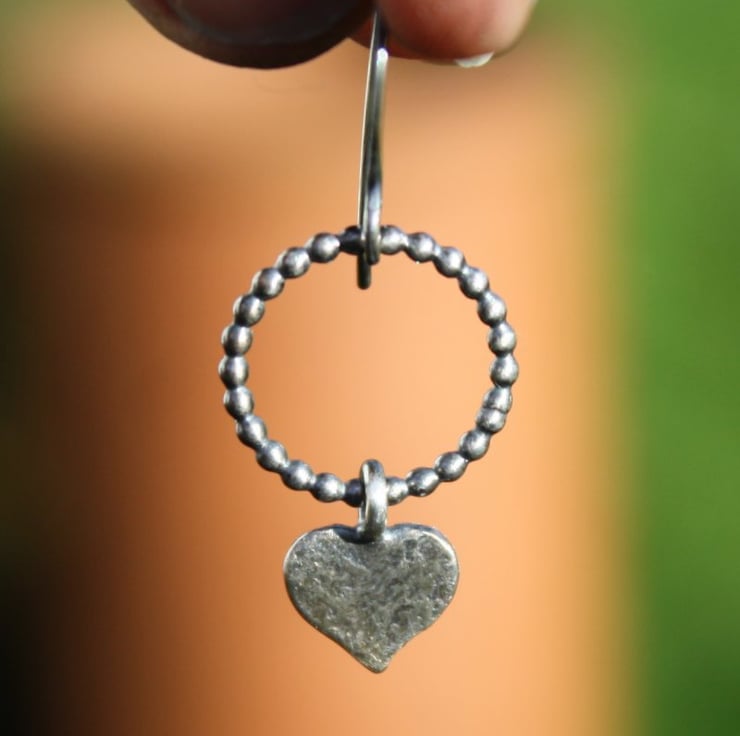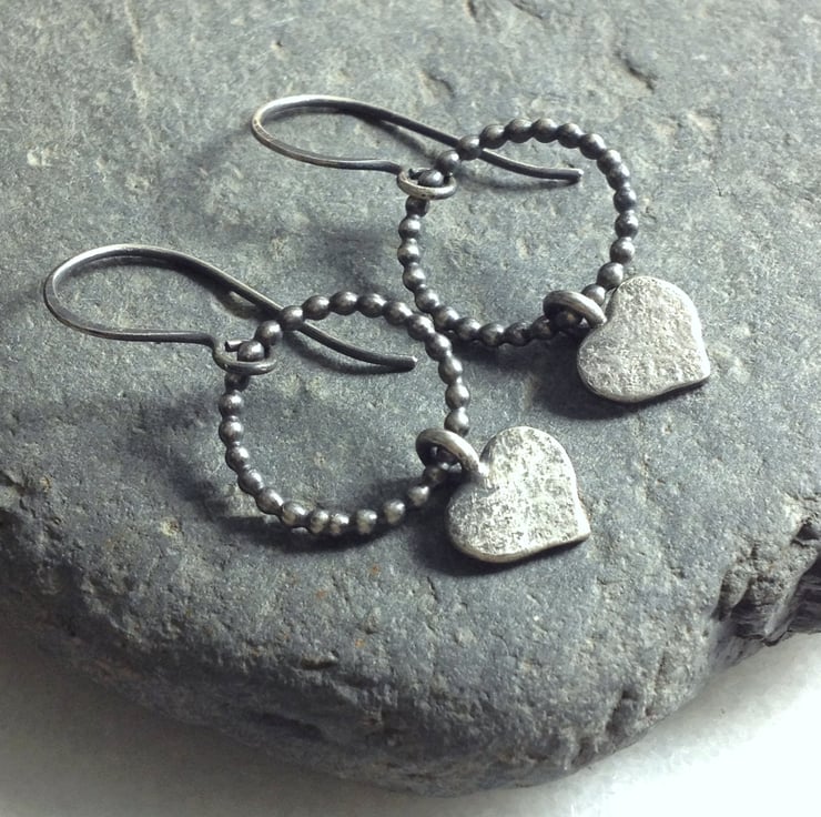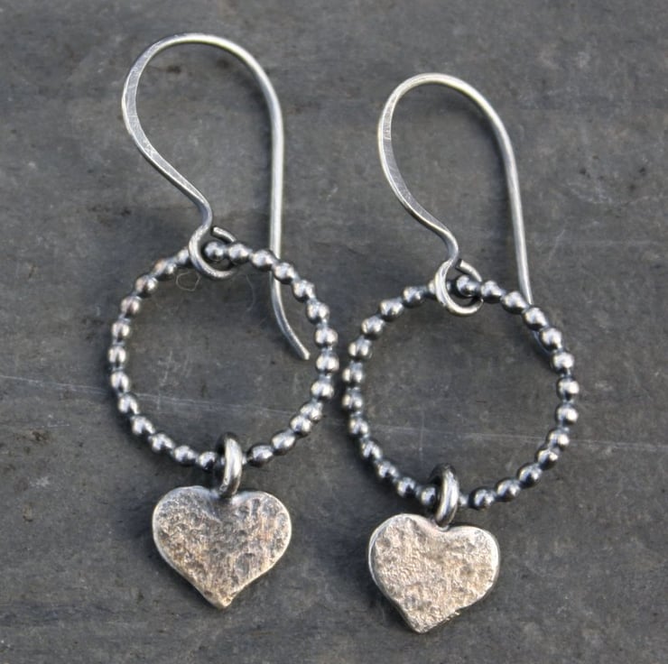 Small textured silver hearts hang from closed beaded wire rings, these hang from handmade sterling ear wires.