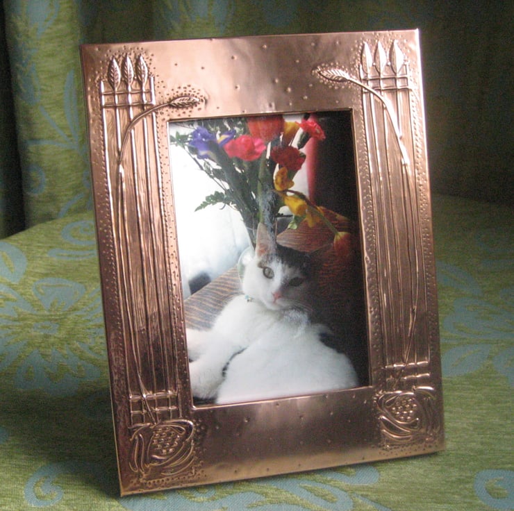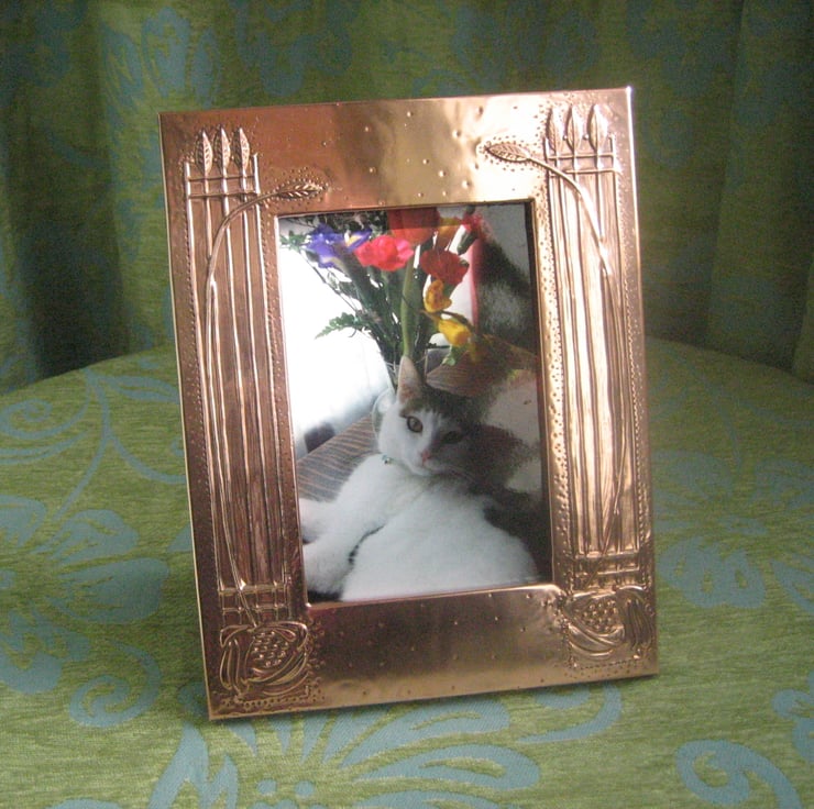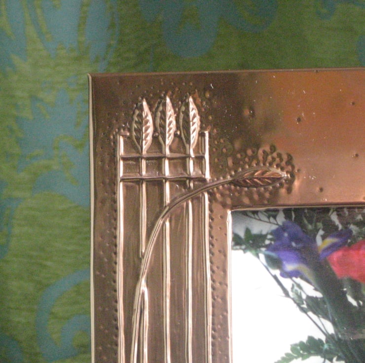 This frame has been hand-made in copper in the Arts and Crafts tradition. The design comprises elements of the work of Charles Rennie Mackintosh and the copper has been patinated and polished to a rich finish.