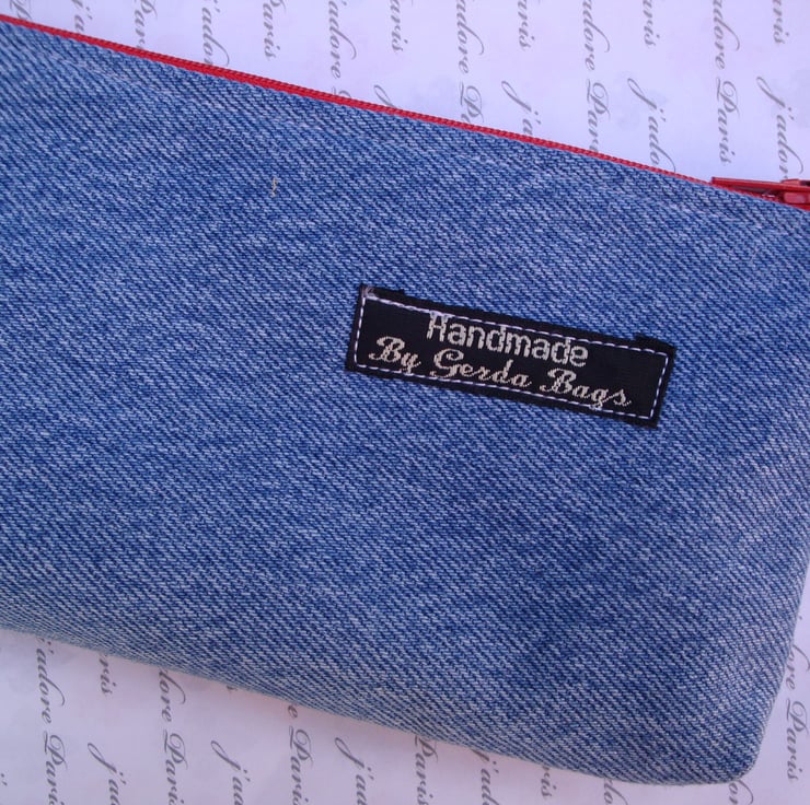 A very unique and funky denim ( recycled denim ) Pencil case , great for storing a selection of your pens and pencils - can also be used for your bits and bobs - make up bag - etc.