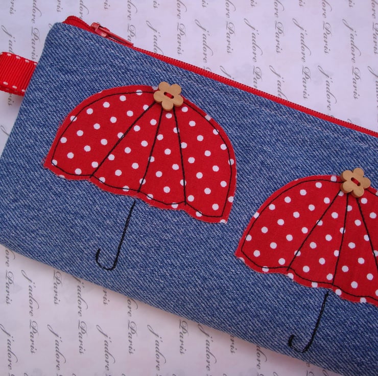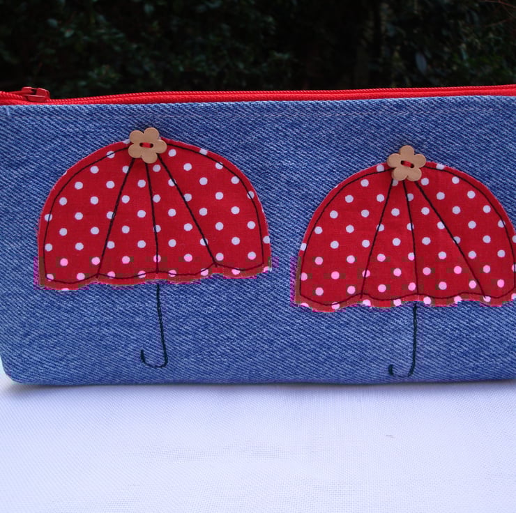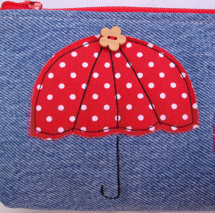I appliquéd 2 very funky umbrellas to the front , made in red polkadot cotton fabric .