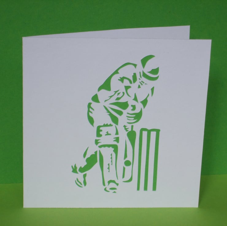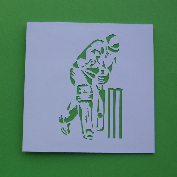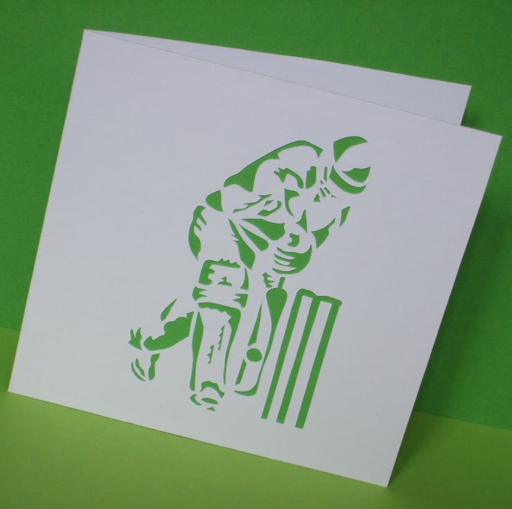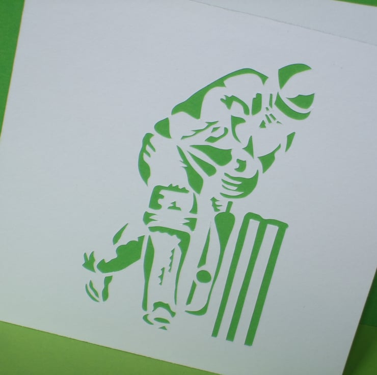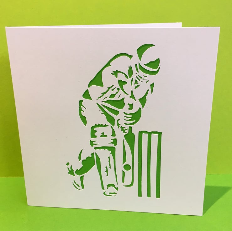This cleverly designed cricket card has been paper cut and coloured paper has been stuck behind the image. The perfect card for any cricket fan, big or small!