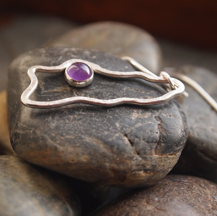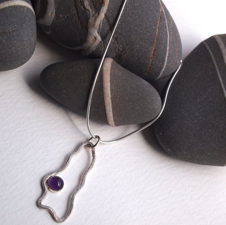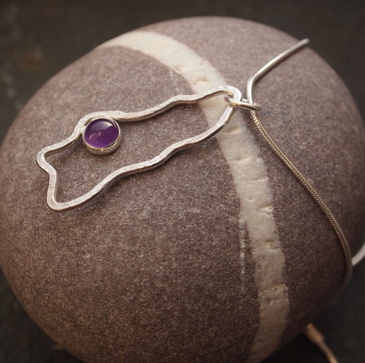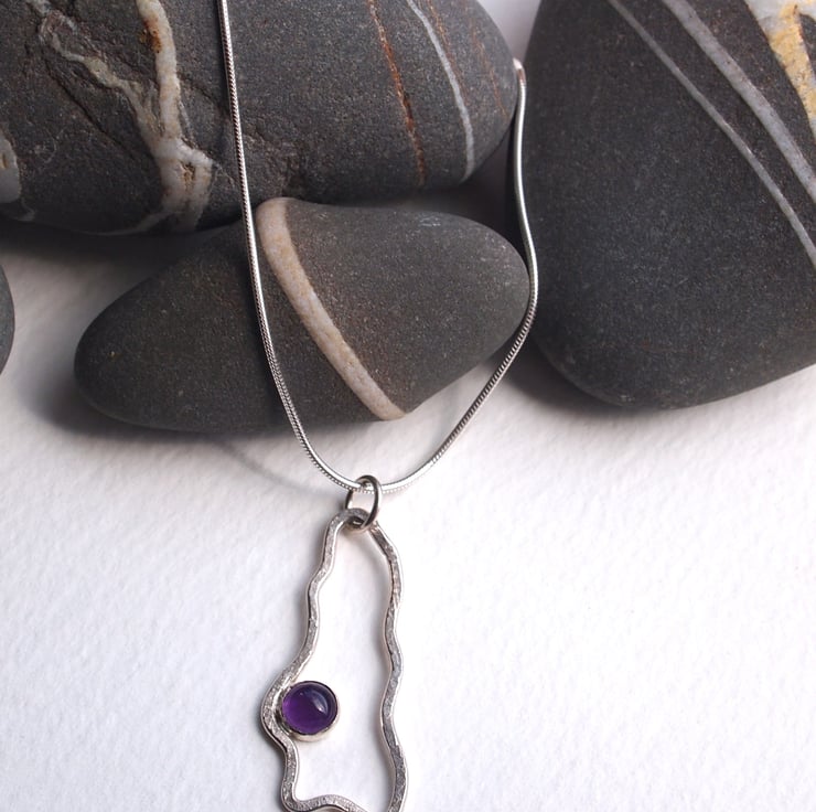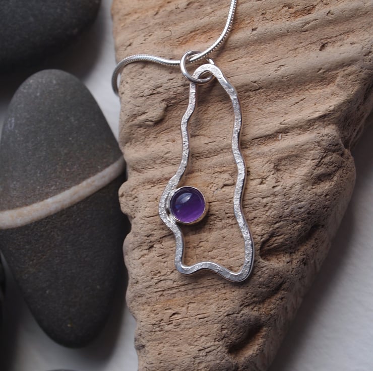 Sterling silver has been formed by hand into a lovely flowing organic shape then gently hammered to add texture before being set with a beautiful purple amethyst stone. This pendant comes on a 16" sterling silver snake chain and has been finished to a high shine.