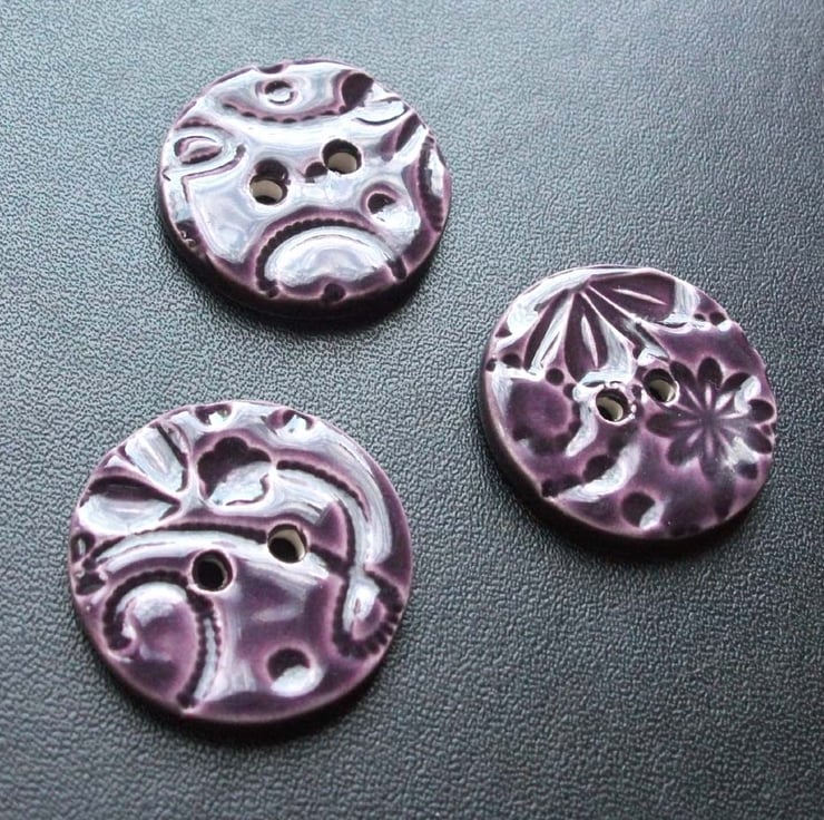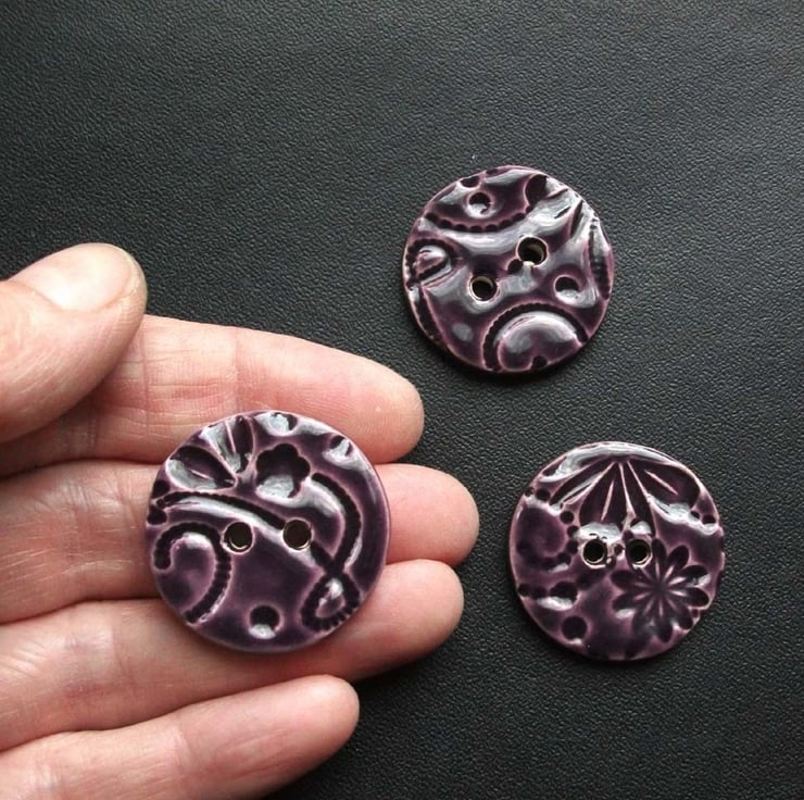 This set of three buttons are made from white earthenware clay, embossed and glazed to 1100 degrees, so nice and strong.