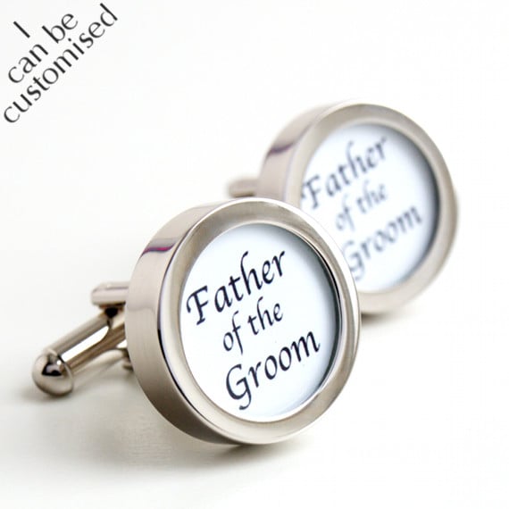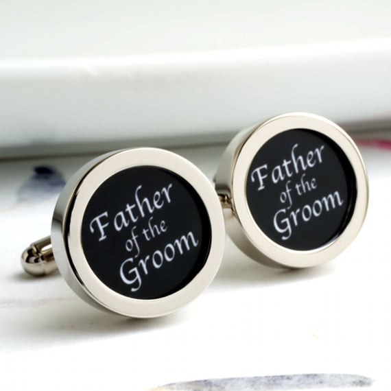 Father of the groom cufflinks in classic black lettering on a white background. Elegant and stylish, these are part of a range for all the wedding party. Also available with a black background.