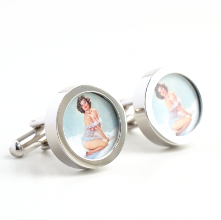 Pin up cufflinks of a vintage brunette wearing very little and holding up her lacy white top. More nude and pinup cufflink designs available.