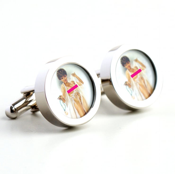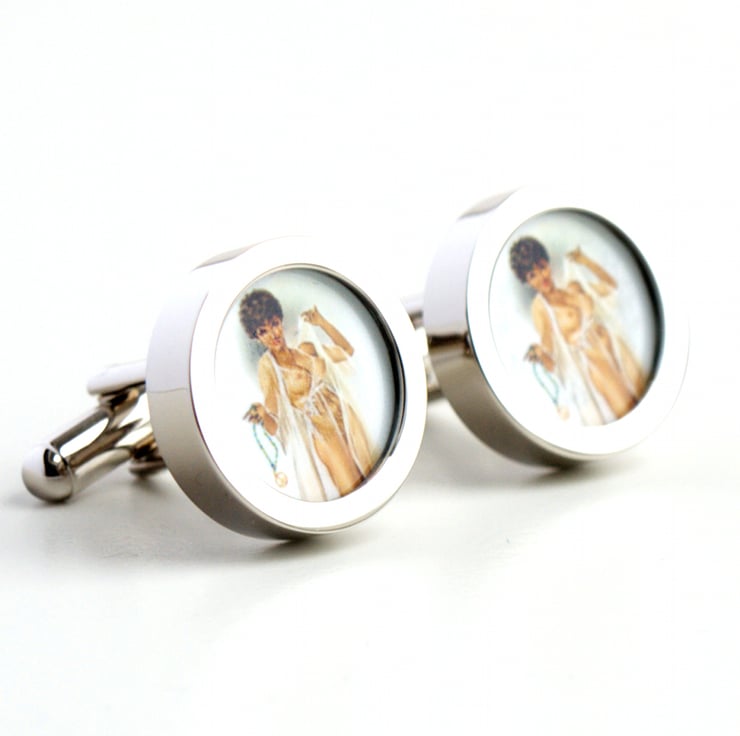 Beautiful vintage image nude pinup cufflinks dressed only in a transparent neglige. More nude and pinup cufflink designs available.