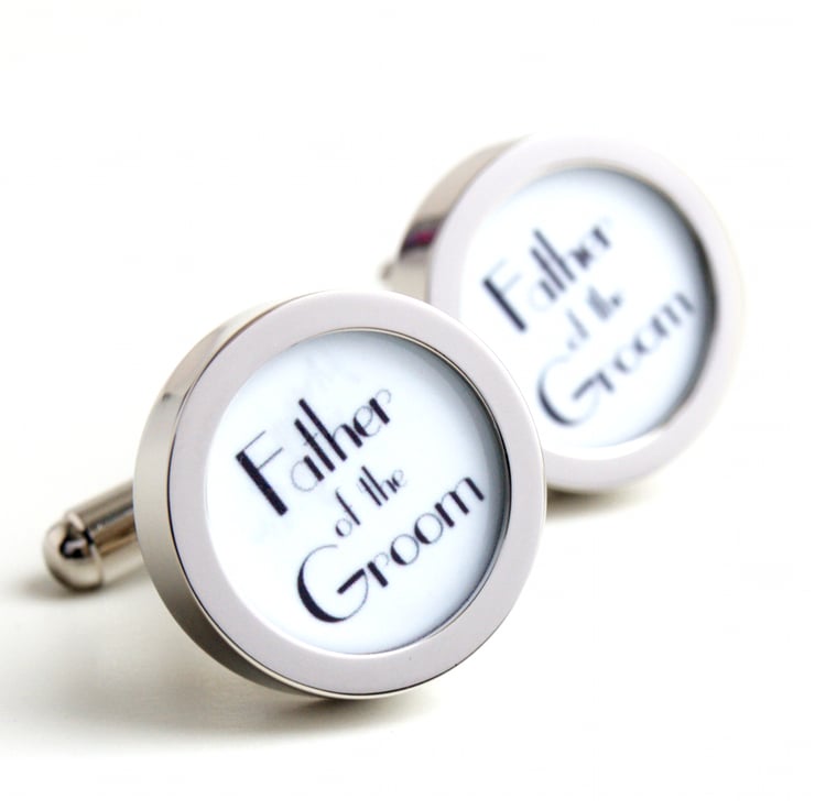 Father of the Groom wedding cufflinks in a 1920s Art Deco style with black lettering on a white background. Part of a range of cufflinks for all of your wedding party.