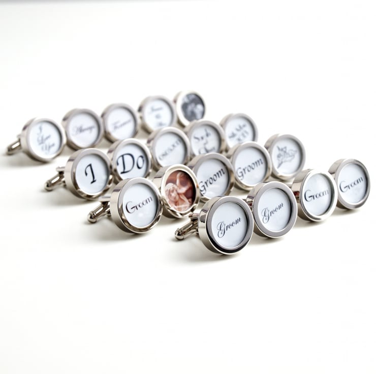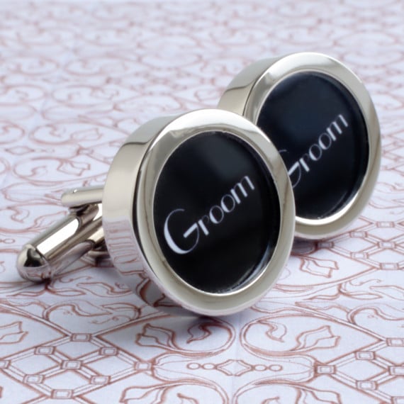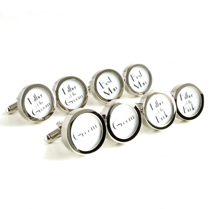 Groom cufflinks in a 1920s Art Deco style with black lettering on a white background. Part of a range of cufflinks for all of your wedding party.