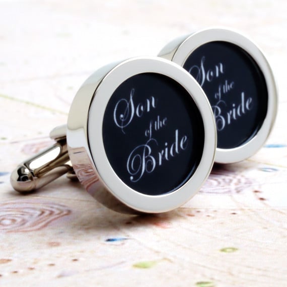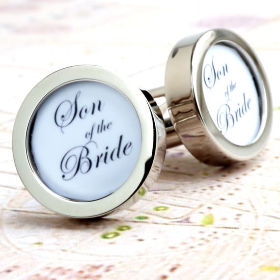Cuff links for the son of the bride in classic script black lettering on a white background. Also available with a white background or your choice of custom colour.