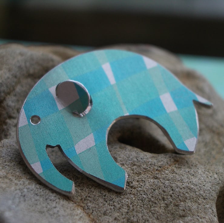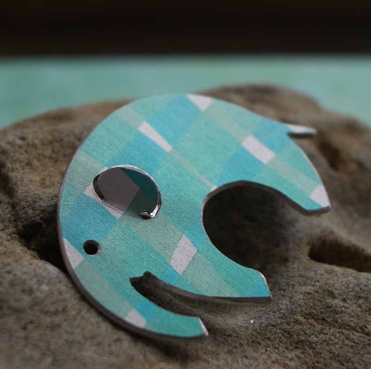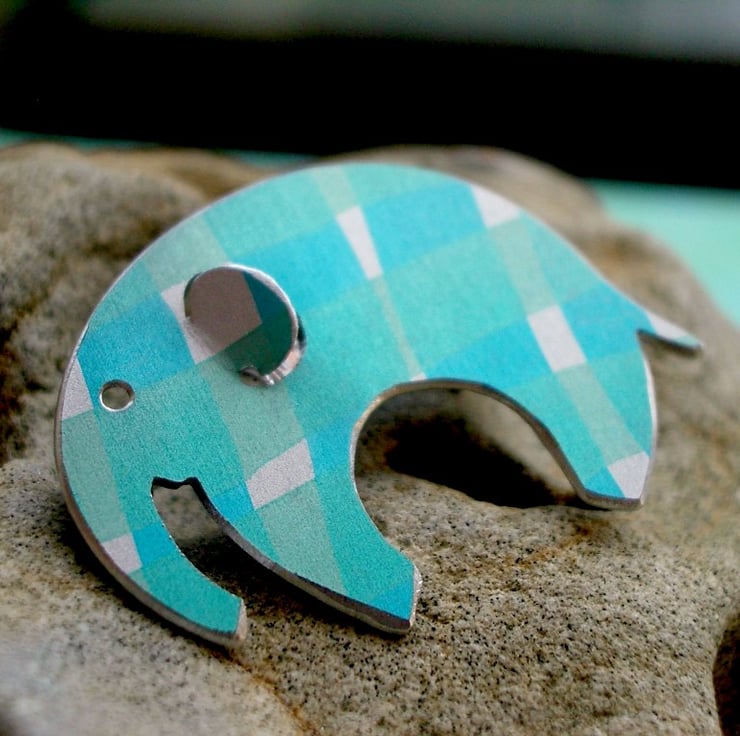 This sweet little elephant brooch has been made from aluminium which I have dyed in ribbons of turquoise and minty green. I then seal the dye so that it becomes a permanent part of the metal. I saw pierce the elephant shape by hand bending the ear a little so that it is more three dimensional and filing the edges to give a nice smooth finish.