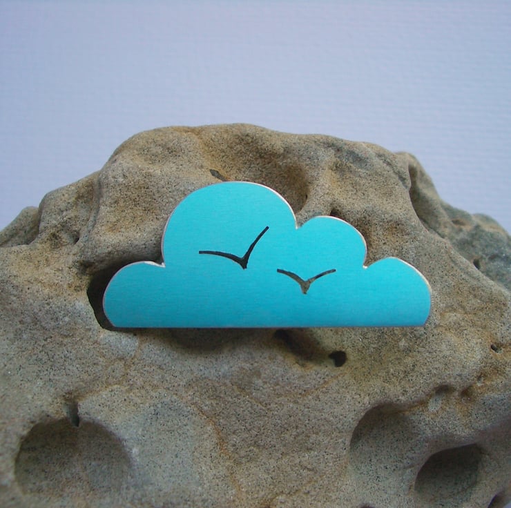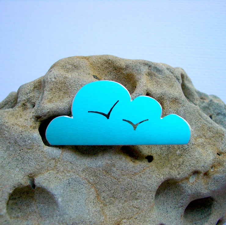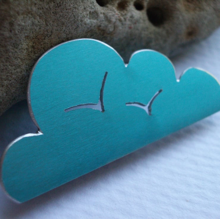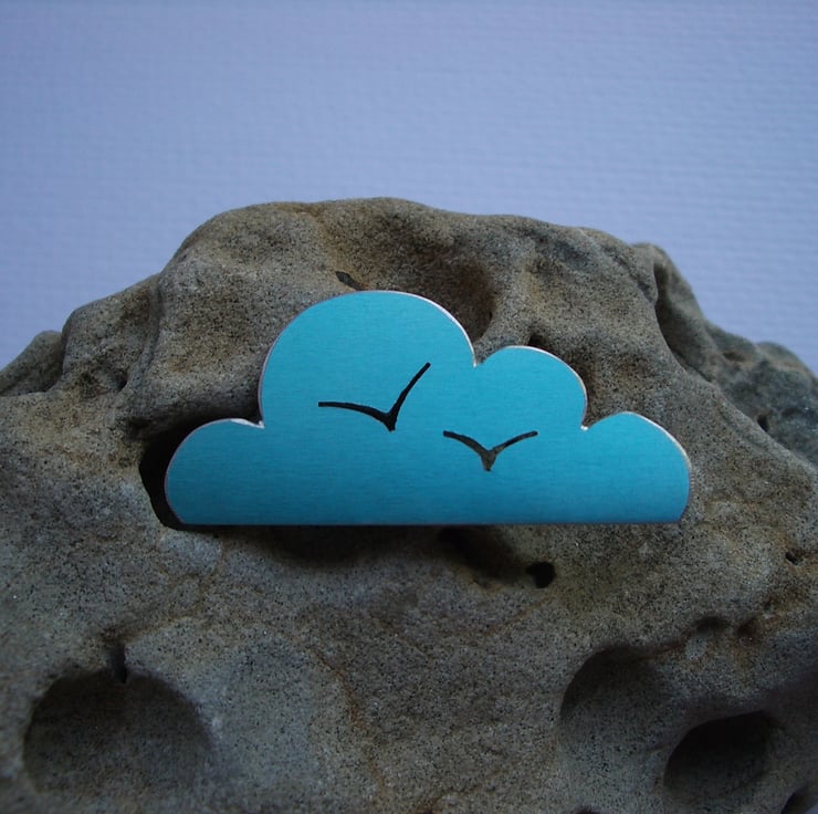 This cloud brooch has been made from aluminium which I have dyed a pale blue and sealed so that the dye becomes a permanent part of the metal. I then saw pierce the cloud and seagull shapes by hand and file the edges to give a nice smooth finish.