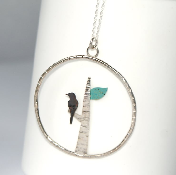 Gorgeous pendant featuring a tiny tree made from textured sterling silver, a little black bird made from oxidised copper and a green leaf made from hand painted aluminium. Set in a textured irregular silver circle and hung from an 18 inch sterling silver chain. (Please message me if you require a different length chain). Please note your necklace may vary very slightly from the image.