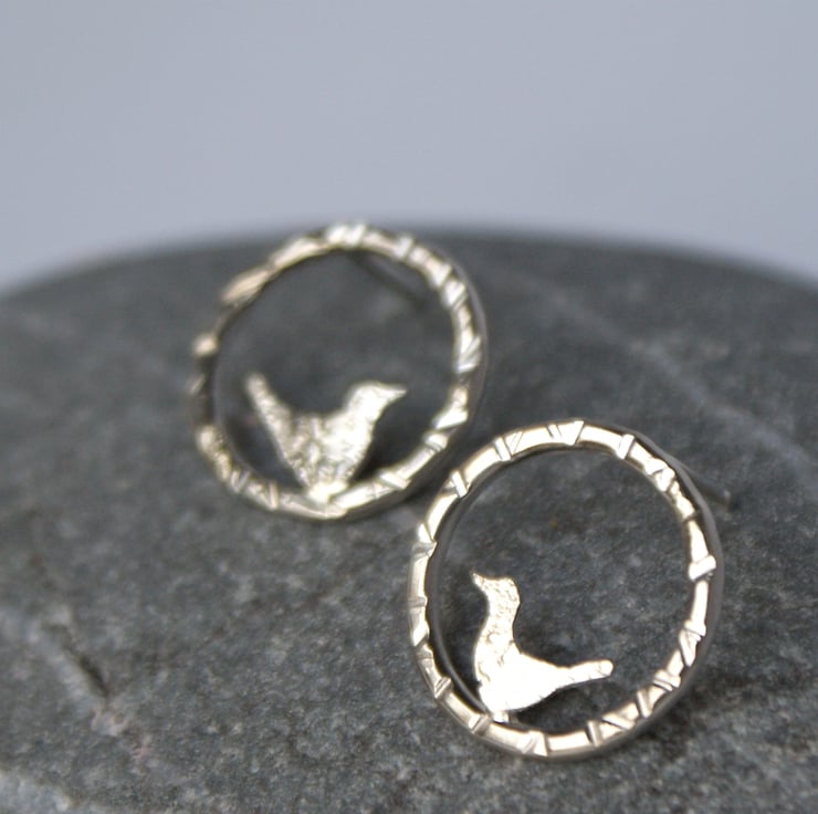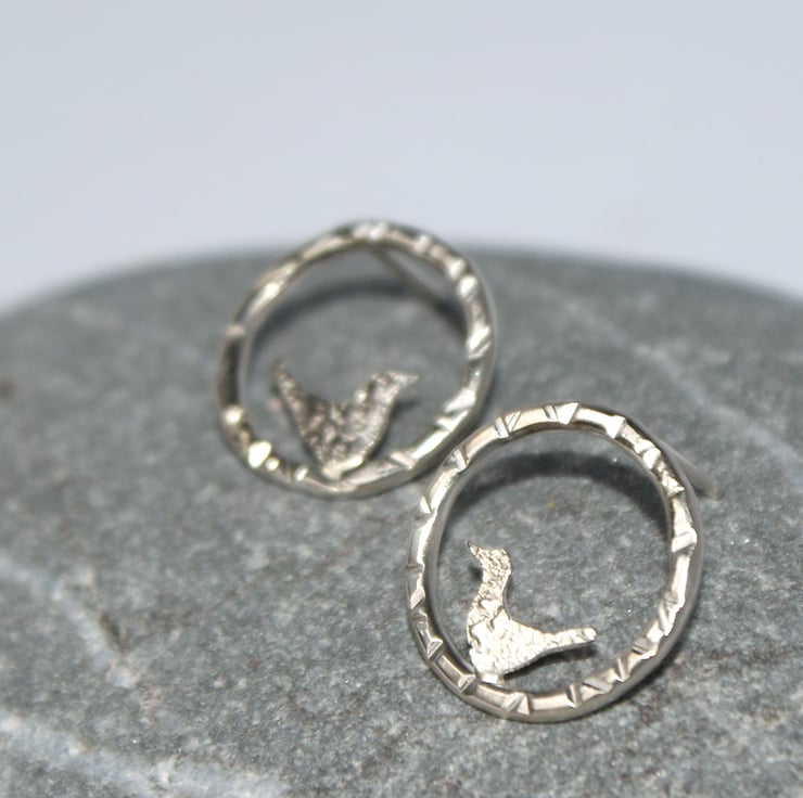 Sweet little earrings featuring tiny cut out silver birds set within a textured silver wire circle. The ear pins are sterling silver and come with silver scrolls. Please note your earrings may vary very slightly from the image.