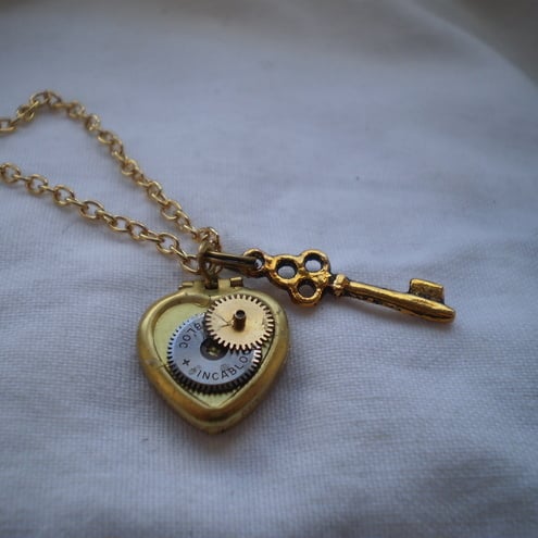 You have My Heart, My Love and My Time locket. This little locket is Vintage 1950's and opens so that you can add a small picture of your own or personalize it if it is a gift to someone. The front of the locket has two tiny watch parts from a vintage pocket watch... and finally a cute key for accent. The goldtone chain is 18 inches.