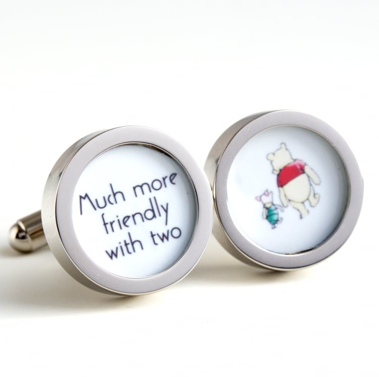Who doesn't love Winnie the Pooh and Piglet? These lovely cufflinks feature a Winnie the Pooh quote 'Much more friendly with two' on one cufflink in scroll black lettering and on the other, a picture of Winnie and his best friend Piglet. The picture of Pooh and Piglet was created by British designer Victoria Hopkins. These make a lovely gift for that special someone in your life, all fans of Pooh, and grooms on their special day. The second picture above shows the cufflinks in a different style of lettering, you can find these in my shop.