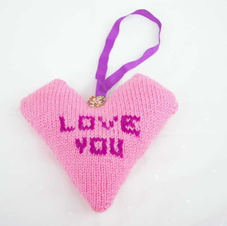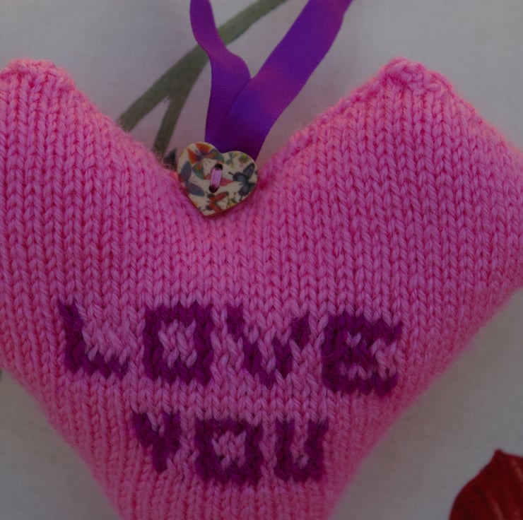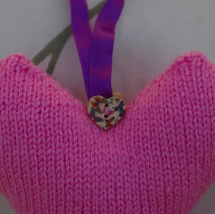 A hand knitted heart decoration in pinks. Very special little gift to say love you that can be hang from a door handle. This heart sends a special message to a loved one whether it’s to a valentine sweet heart or a family member who needs a hug. The heart has been knitted in 100% Acrylic yarns. Then stuffed with polyester hollow fibres which have been treated with an anti allergy treatment. It is hung with a purple ribbon and decorated with two heart wooden buttons.
