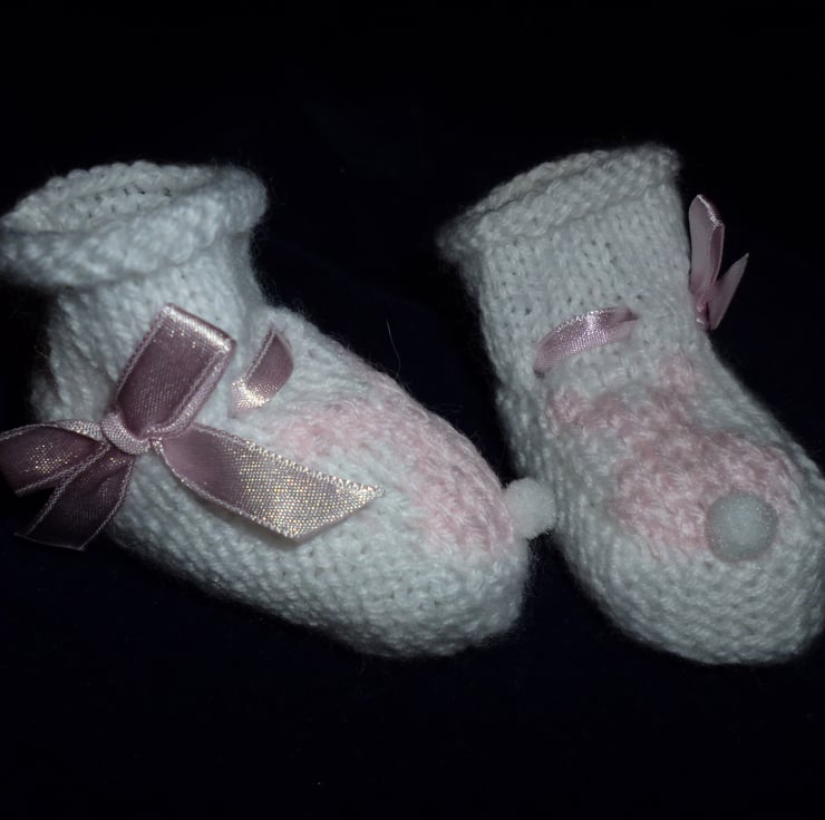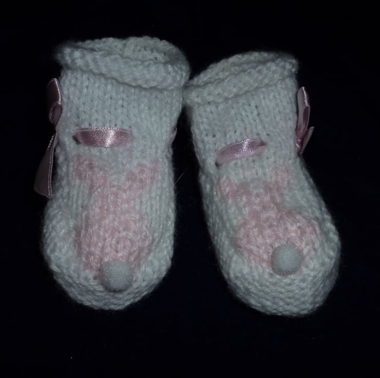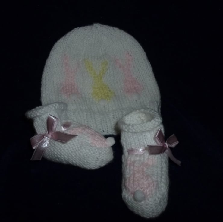 Hand knitted baby bunny tails hat & booties- white with pink & yellow bunnies