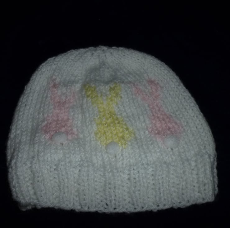 A beautiful hand knitted hat in white incorporating a three bunny silhouette motif.