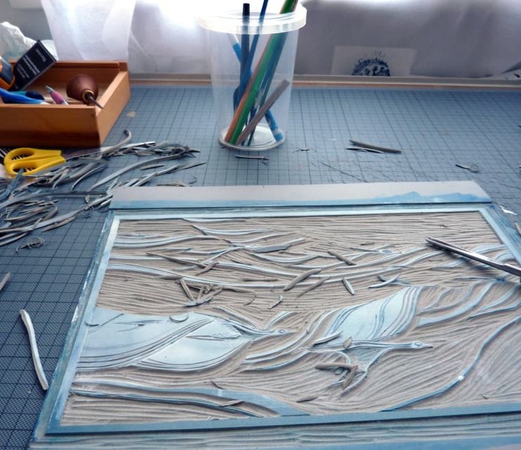 It was created by the reduction method: the areas of white were cut away first, the blue printed, then all but the swathes for the darker colour were cut away and the plate was printed again in a darker blue. I use oil-based but water washable inks and Zerkal printmaking paper for this print. This is small edition of just 26 prints.