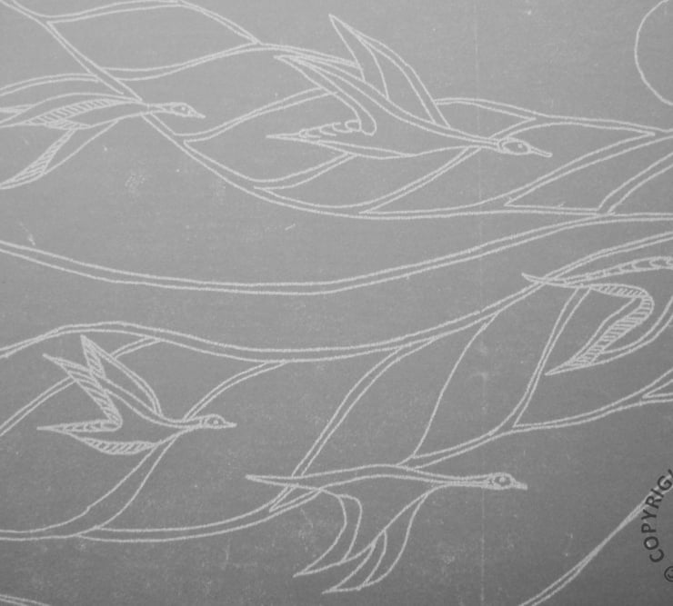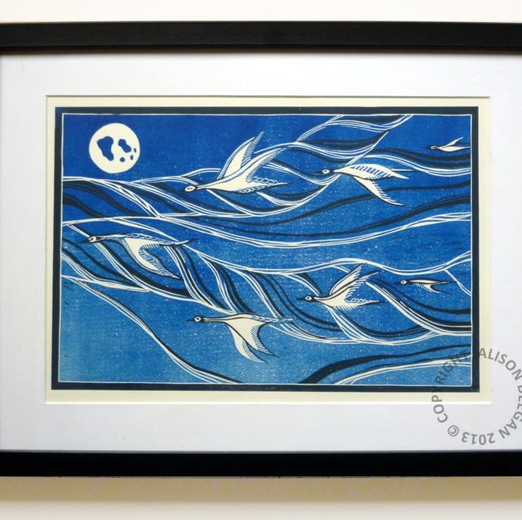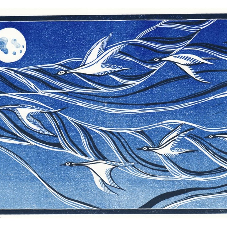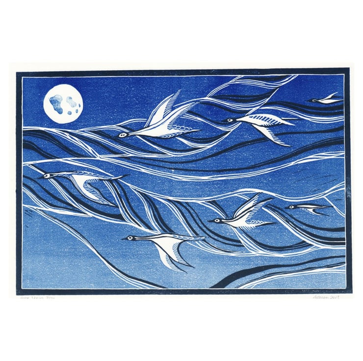“GOOSE SKEIN” is an original lino print.