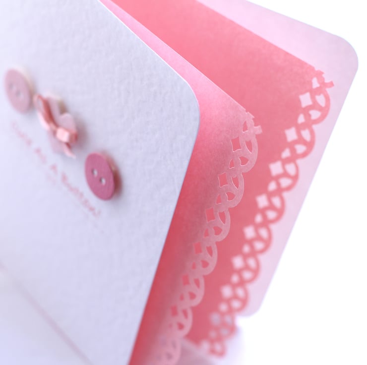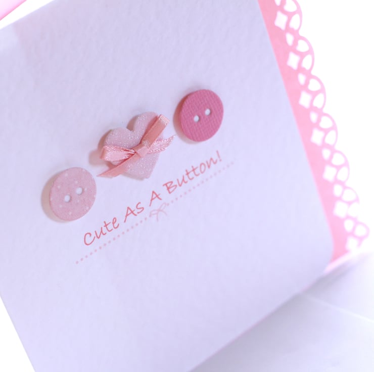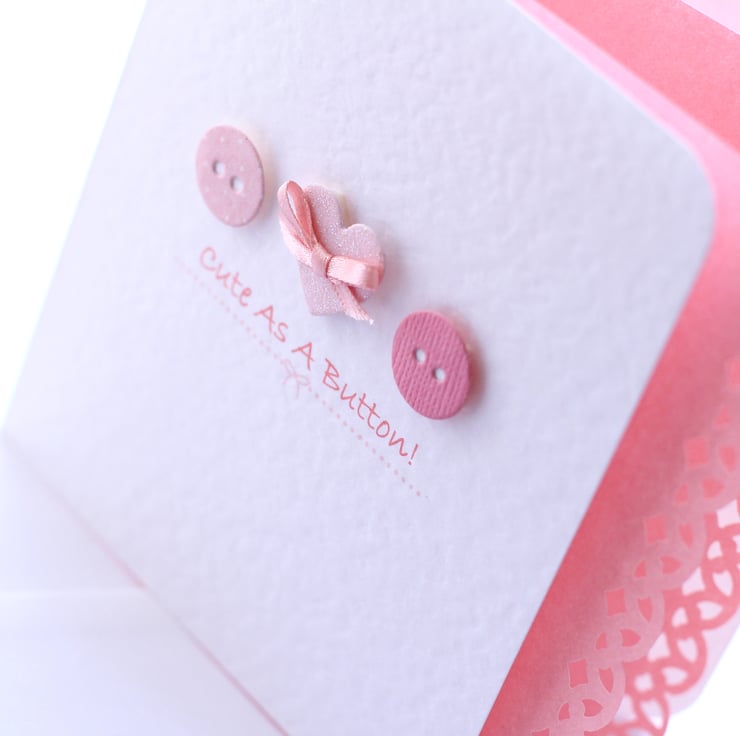 The main body of the card features a cut away detail to the side revealing the contrasting pink paper, lace die cut detail insert. To complete the design, 'Cute As A Button' has been printed in pink on the front.