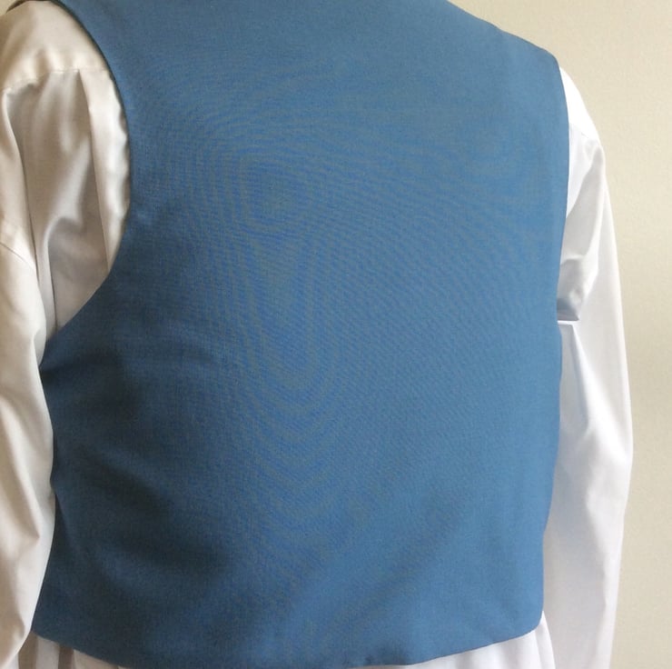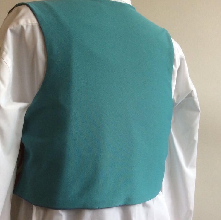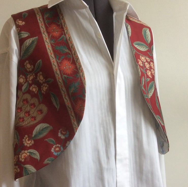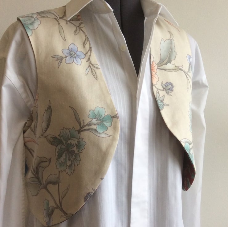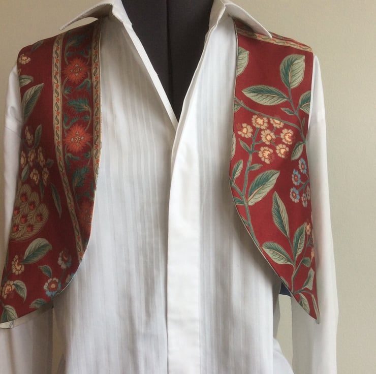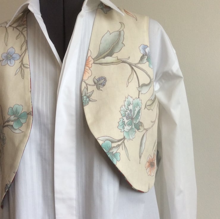 An exclusive, one off design, this hand made sleeveless jacket/waistcoat is for you if you are a fan of florals! On one side of the jacket the fabric has a deep red background with flowers, leaves and a floral border motif, assymetrically aligned to add impact.The back is a light turquoise, crepe fabric. On the reverse of the jacket the fabric has a cream background with flowers and leaves in pastel shades. The back is a mid blue cotton twill. With the front edges together it measures 92cm/36inches around the chest and is 39cm/15.5 inches from the neck to bottom of the jacket.