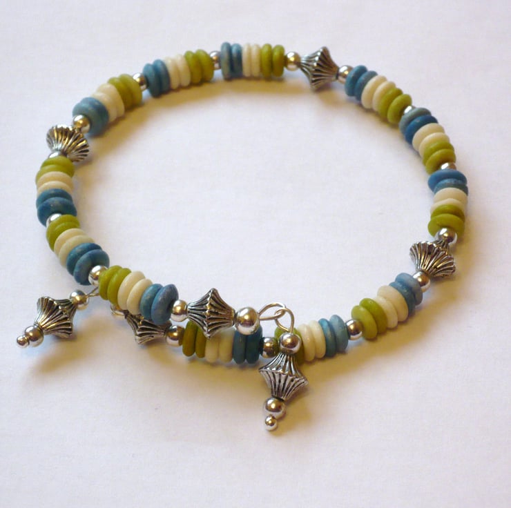 An overlapped single coil of memory wire makes this bracelet simple but stylish. I have matched the beads to compliment each other with a hint of silver as an accent.