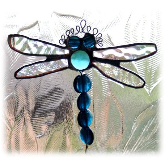 A very pretty little turquoise dragonfly with iridescent textured clear glass wings and aqua beads for eyes, body and tail.